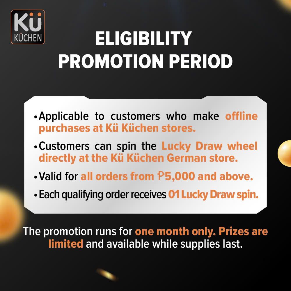 During the campaign period, customers who make an in-store purchase of ₱5,000 or more at any Kü Küchen German store will receive 01 immediate spin on the Lucky Wheel.
