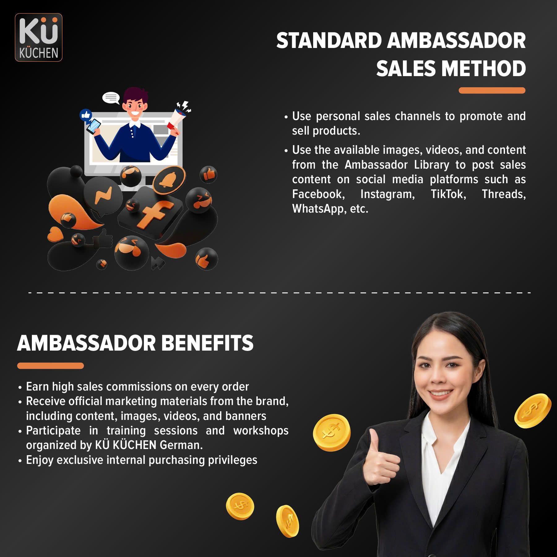 As a KÜ KÜCHEN German Ambassador, you will enjoy a comprehensive set of benefits designed to support long-term success: