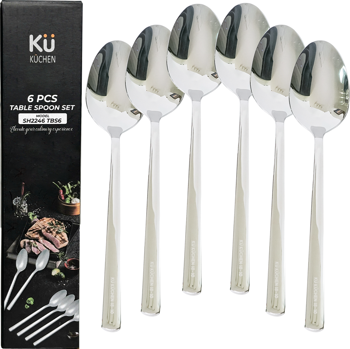 The KUCHEN SH2246 TBS6 Spoon Set includes six premium dining spoons, meticulously crafted from high-quality 18/10 stainless steel. Designed with a refined blend of simplicity and elegance, the spoons seamlessly complement any dining space—whether modern, minimalist, or traditional.